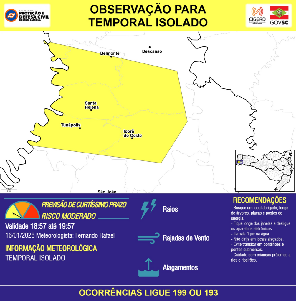 OBSERVAÇÃO – 16/01 18:57 – TEMPORAL ISOLADO com RAIOS, RAJADAS DE VENTO e ALAGAMENTOS pontuais para os municípios de Bandeirante, Belmonte, Descanso, Iporã do Oeste, Santa Helena, São João do Oeste e Tunápolis na próxima hora. Ocorrências ligue 199 ou 193.