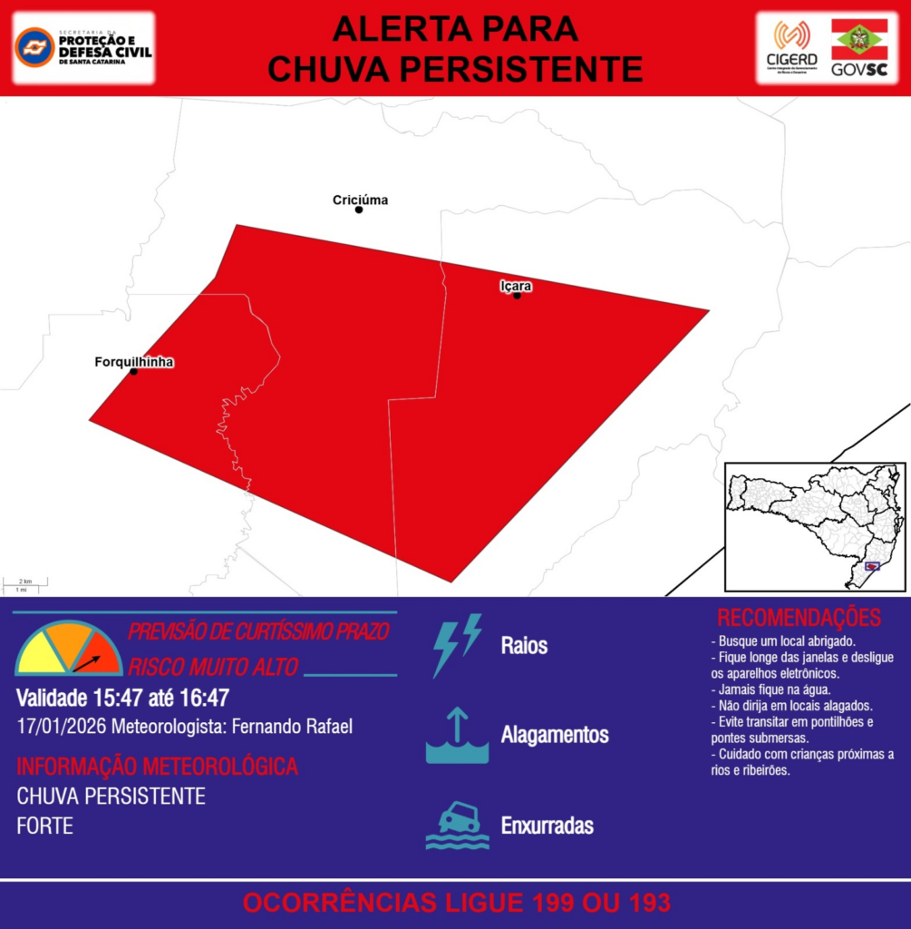 ALERTA – 17/01 15:47 – CHUVA PERSISTENTE de intensidade forte com RAIOS, ALAGAMENTOS e risco de ENXURRADAS para os municípios de Criciúma, Forquilhinha e Içara na próxima hora. Ocorrências ligue 199 ou 193.