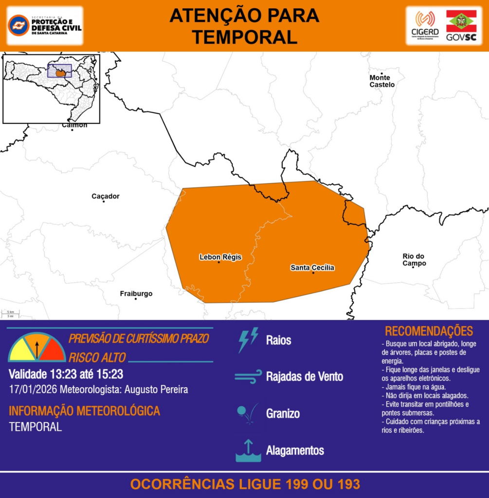 ATENÇÃO – 17/01 13:23 – TEMPORAL com RAIOS, RAJADAS DE VENTO, GRANIZO e ALAGAMENTOS para as regiões do Meio-Oeste, Planalto Norte e Alto Vale do Itajaí nas próximas 2 horas. Ocorrências ligue 199 ou 193.