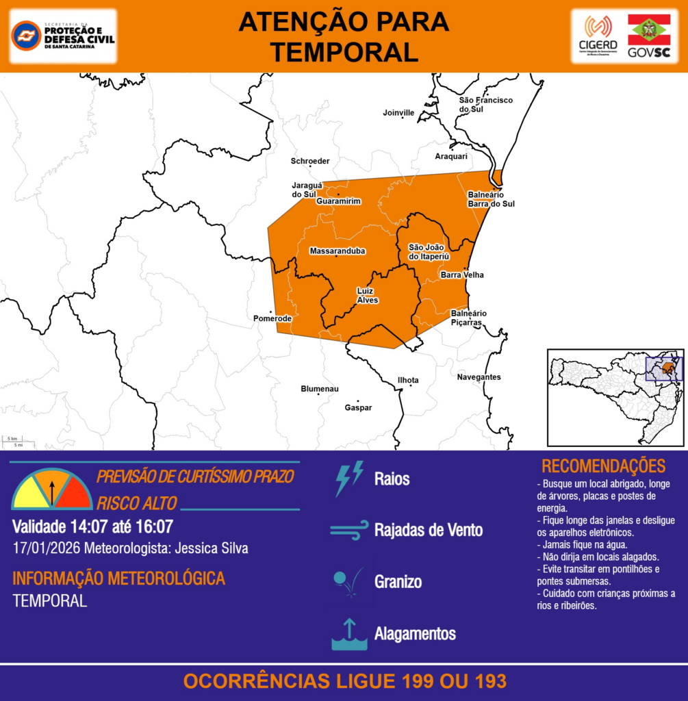 ATENÇÃO – 17/01 14:07 – TEMPORAL com RAIOS, RAJADAS DE VENTO, GRANIZO e ALAGAMENTOS para os municípios de Araquari, Balneário Barra do Sul, Balneário Piçarras, Barra Velha, Blumenau, Gaspar, Guaramirim, Ilhota, Jaraguá do Sul, Joinville, Luiz Alves, Massaranduba, Navegantes, Pomerode, Schroeder, São Francisco do Sul e São João do Itaperiú nas próximas 2 horas. Ocorrências ligue 199 ou 193.