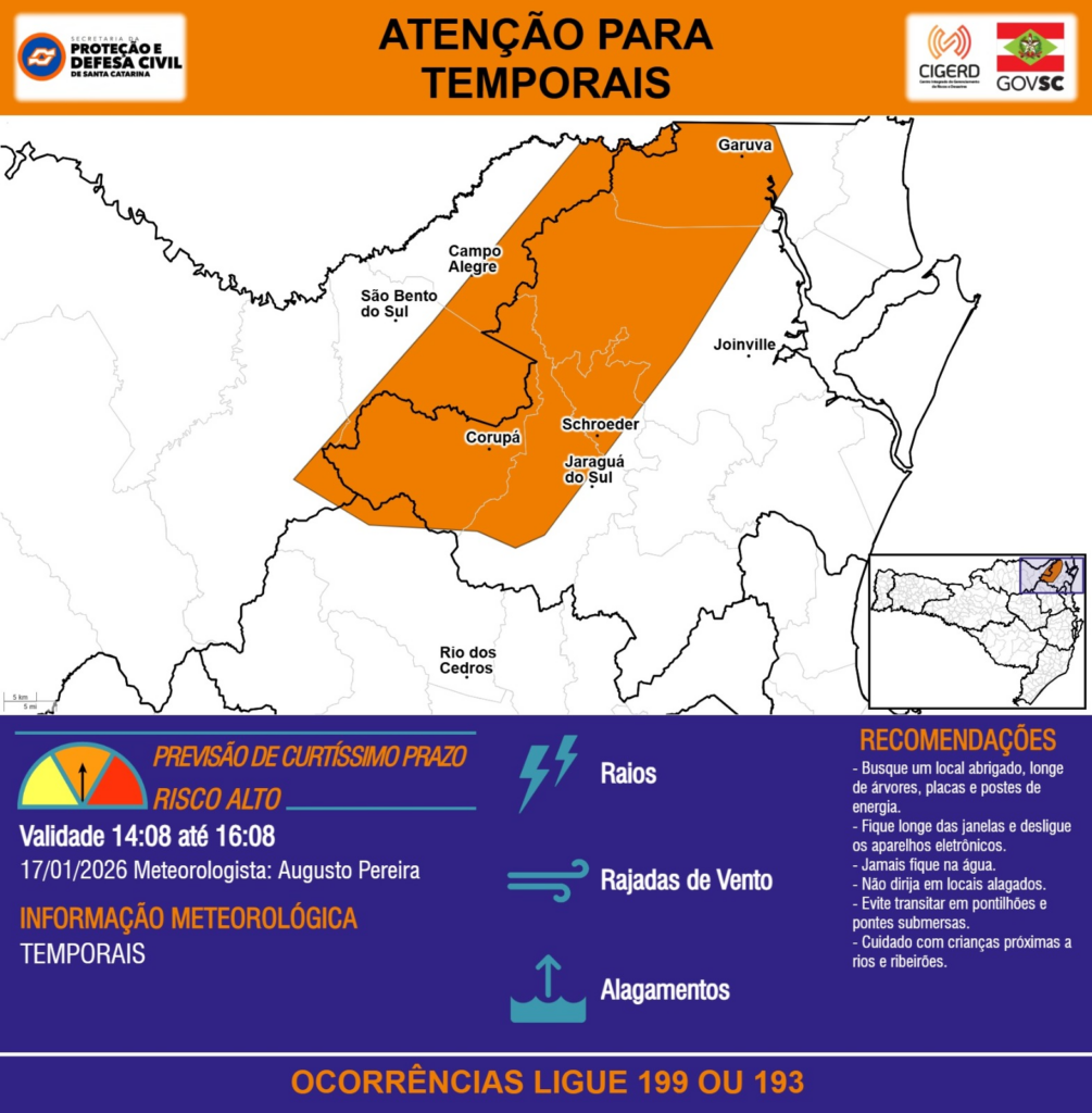 ATENÇÃO – 17/01 14:08 – TEMPORAIS com RAIOS, RAJADAS DE VENTO e ALAGAMENTOS para as regiões do Planalto Norte, Litoral Norte e Médio Vale do Itajaí nas próximas 2 horas. Ocorrências ligue 199 ou 193.