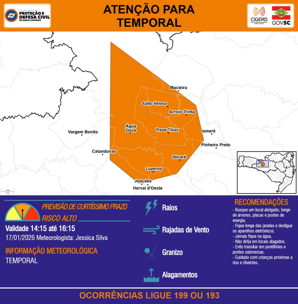 ATENÇÃO – 17/01 14:15 – TEMPORAL com RAIOS, RAJADAS DE VENTO, GRANIZO e ALAGAMENTOS para os municípios de Arroio Trinta, Catanduvas, Herval d’Oeste, Ibicaré, Iomerê, Joaçaba, Luzerna, Macieira, Pinheiro Preto, Salto Veloso, Treze Tílias, Vargem Bonita e Água Doce nas próximas 2 horas. Ocorrências ligue 199 ou 193.
