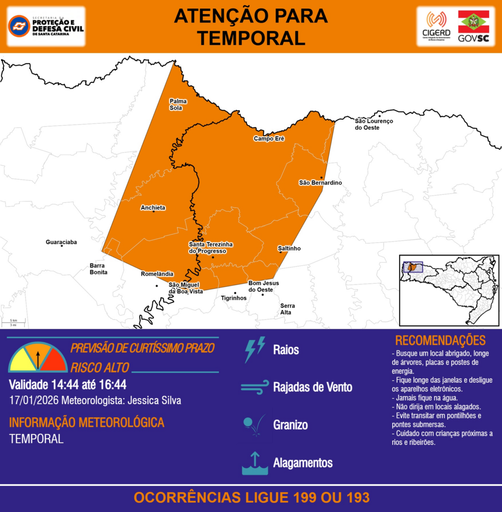 ATENÇÃO – 17/01 14:44 – TEMPORAL com RAIOS, RAJADAS DE VENTO, GRANIZO e ALAGAMENTOS para os municípios de Anchieta, Barra Bonita, Bom Jesus do Oeste, Campo Erê, Guaraciaba, Palma Sola, Romelândia, Saltinho, Santa Terezinha do Progresso, Serra Alta, São Bernardino, São Lourenço do Oeste, São Miguel da Boa Vista e Tigrinhos nas próximas 2 horas. Ocorrências ligue 199 ou 193.