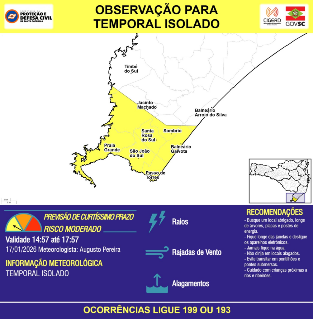 A Secretaria da Proteção e Defesa Civil segue monitorando as condições meteorológicas. Esteja preparado para tomar as ações necessárias em caso de agravamento da situação.