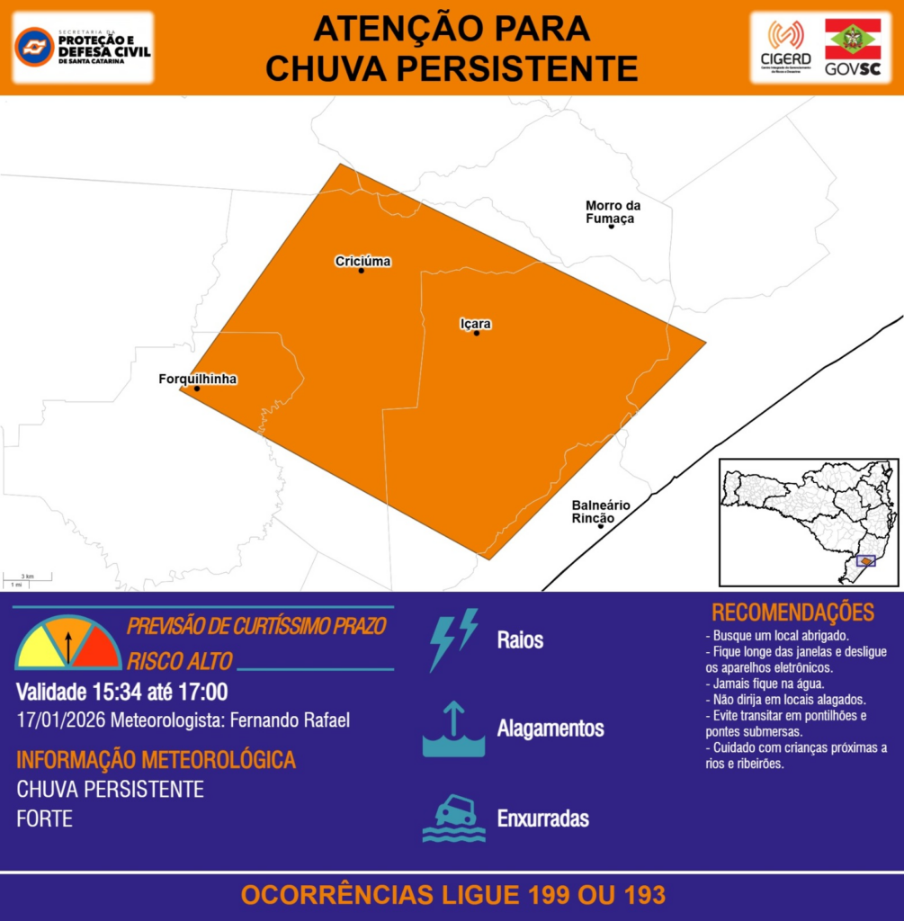 ATENÇÃO – 17/01 15:34 – CHUVA PERSISTENTE de intensidade forte com RAIOS, ALAGAMENTOS e risco de ENXURRADAS para os municípios de Balneário Rincão, Criciúma, Forquilhinha, Içara e Morro da Fumaça na próxima hora. Ocorrências ligue 199 ou 193.