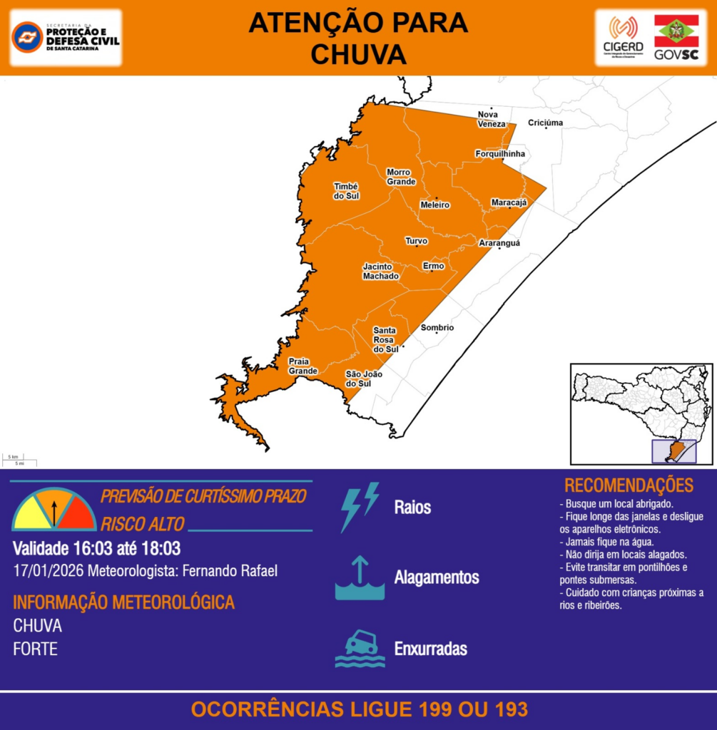 ATENÇÃO – 17/01 16:03 – CHUVA de intensidade forte com RAIOS, ALAGAMENTOS e risco de ENXURRADAS para os municípios de Araranguá, Criciúma, Ermo, Forquilhinha, Jacinto Machado, Maracajá, Meleiro, Morro Grande, Nova Veneza, Praia Grande, Santa Rosa do Sul, Sombrio, São João do Sul, Timbé do Sul e Turvo nas próximas 2 horas. Ocorrências ligue 199 ou 193.