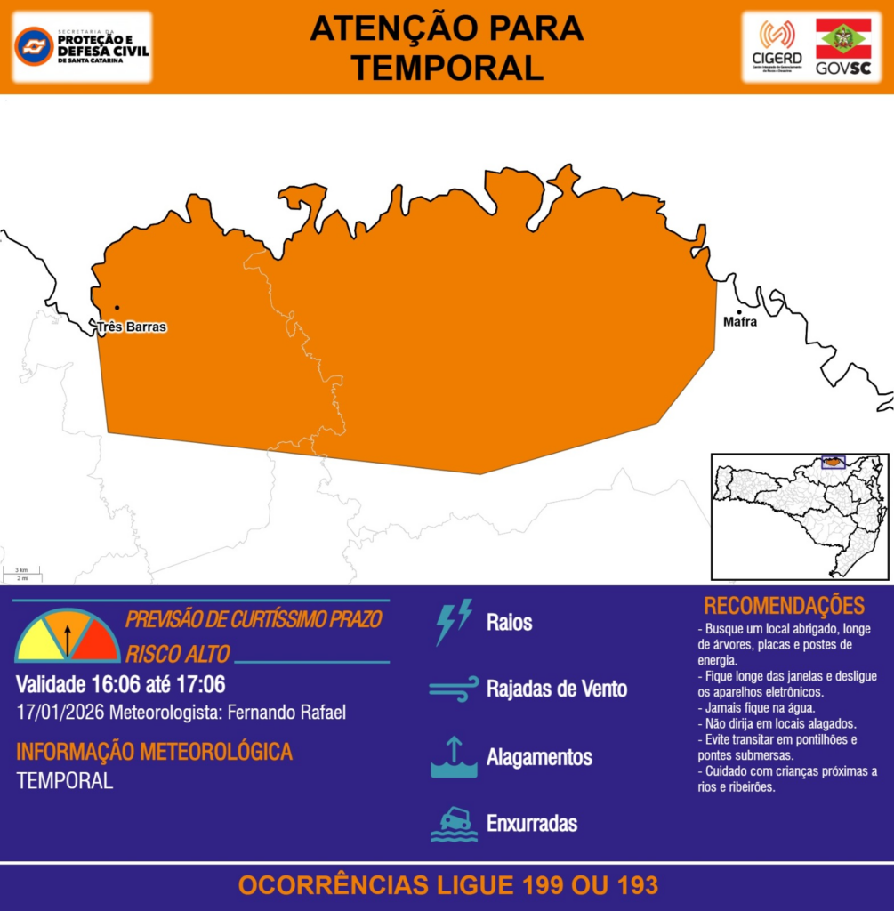 ATENÇÃO – 17/01 16:06 – TEMPORAL com RAIOS, RAJADAS DE VENTO, ALAGAMENTOS e risco de ENXURRADAS para os municípios de Mafra, Papanduva e Três Barras na próxima hora. Ocorrências ligue 199 ou 193.