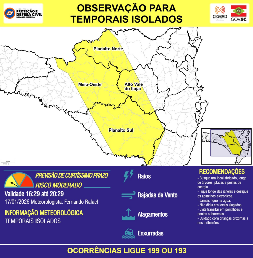 OBSERVAÇÃO – 17/01 16:29 – TEMPORAIS ISOLADOS com RAIOS, RAJADAS DE VENTO, ALAGAMENTOS pontuais e risco de ENXURRADAS para as regiões do Meio-Oeste, Planalto Norte, Planalto Sul e Alto Vale do Itajaí nas próximas 4 horas. Ocorrências ligue 199 ou 193.