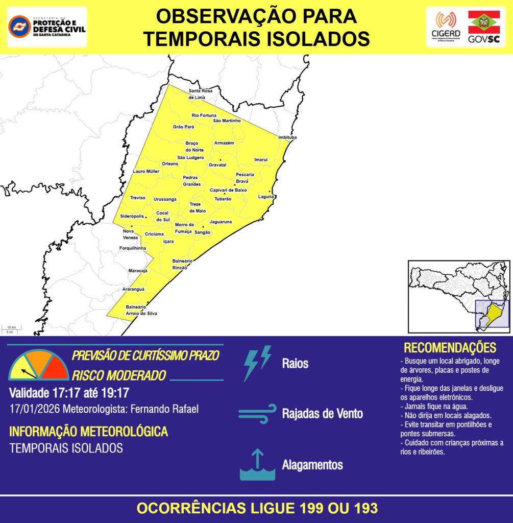 OBSERVAÇÃO – 17/01 17:17 – TEMPORAIS ISOLADOS com RAIOS, RAJADAS DE VENTO e ALAGAMENTOS pontuais para os municípios de Araranguá, Armazém, Balneário Arroio do Silva, Balneário Gaivota, Balneário Rincão, Braço do Norte, Capivari de Baixo, Cocal do Sul, Criciúma, Forquilhinha, Gravatal, Grão Pará, Imaruí, Imbituba, Içara, Jaguaruna, Laguna, Lauro Müller, Maracajá, Morro da Fumaça, Nova Veneza, Orleans, Pedras Grandes, Pescaria Brava, Rio Fortuna, Sangão, Santa Rosa de Lima, Siderópolis, São Ludgero, São Martinho, Treviso, Treze de Maio, Tubarão e Urussanga nas próximas 2 horas. Ocorrências ligue 199 ou 193.