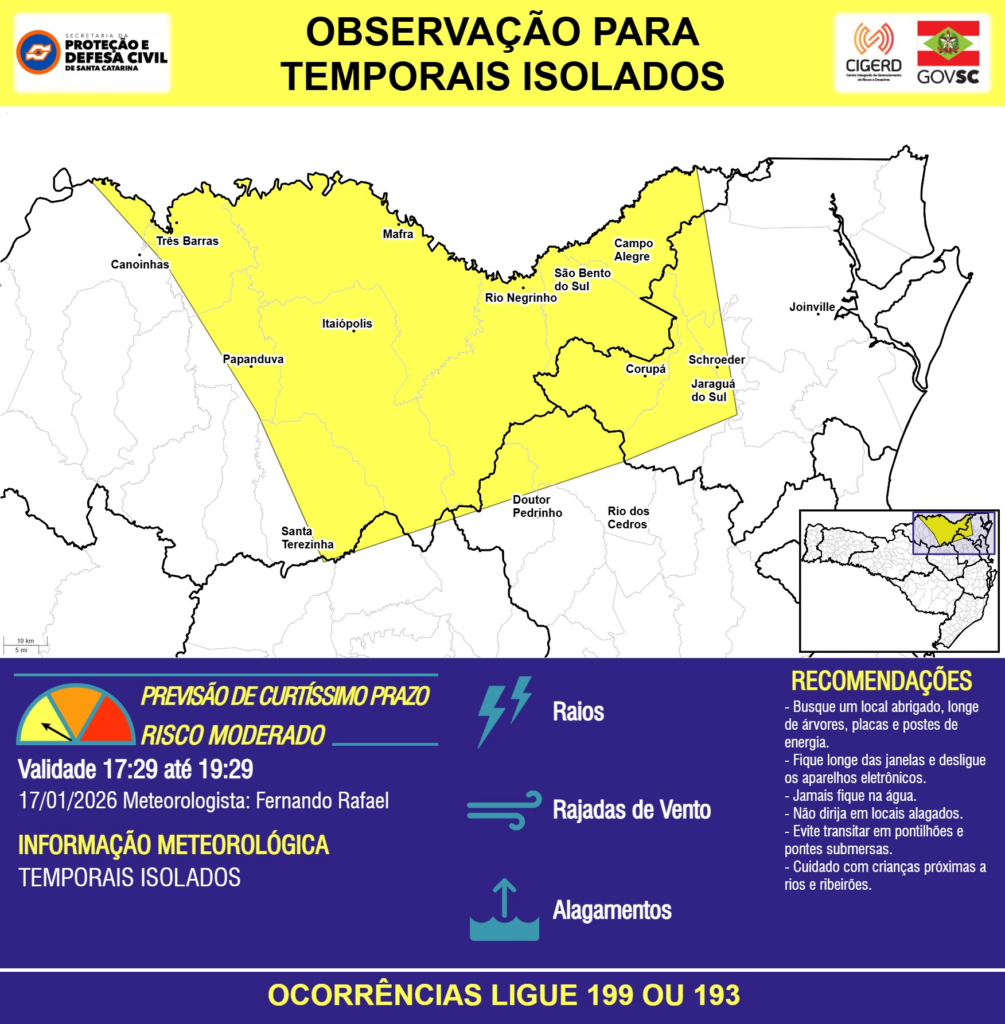 OBSERVAÇÃO – 17/01 17:29 – TEMPORAIS ISOLADOS com RAIOS, RAJADAS DE VENTO e ALAGAMENTOS pontuais para os municípios de Campo Alegre, Canoinhas, Corupá, Doutor Pedrinho, Itaiópolis, Jaraguá do Sul, Joinville, Mafra, Papanduva, Rio Negrinho, Rio dos Cedros, Santa Terezinha, Schroeder, São Bento do Sul, Três Barras nas próximas 2 horas. Ocorrências ligue 199 ou 193.
