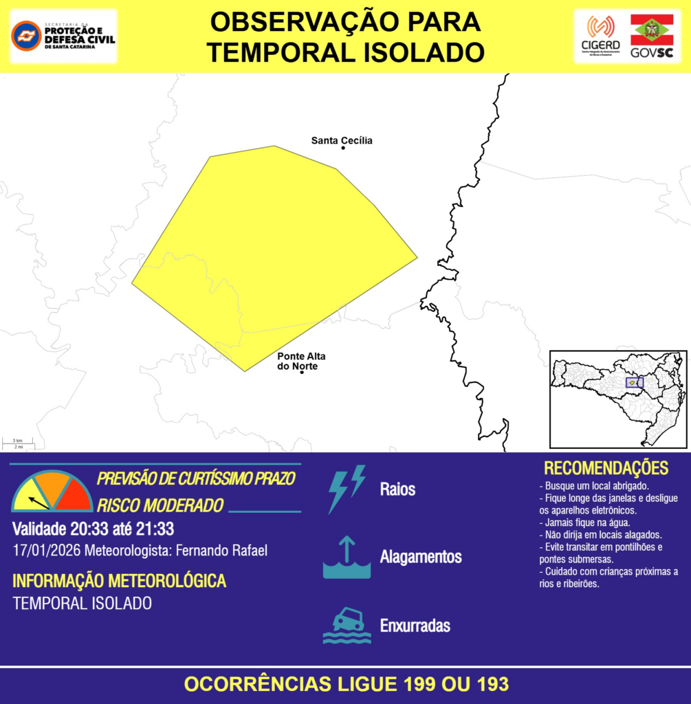OBSERVAÇÃO – 17/01 20:33 – TEMPORAL ISOLADO com RAIOS, ALAGAMENTOS pontuais e risco de ENXURRADAS para os municípios de Curitibanos, Ponte Alta do Norte e Santa Cecília na próxima hora. Ocorrências ligue 199 ou 193.