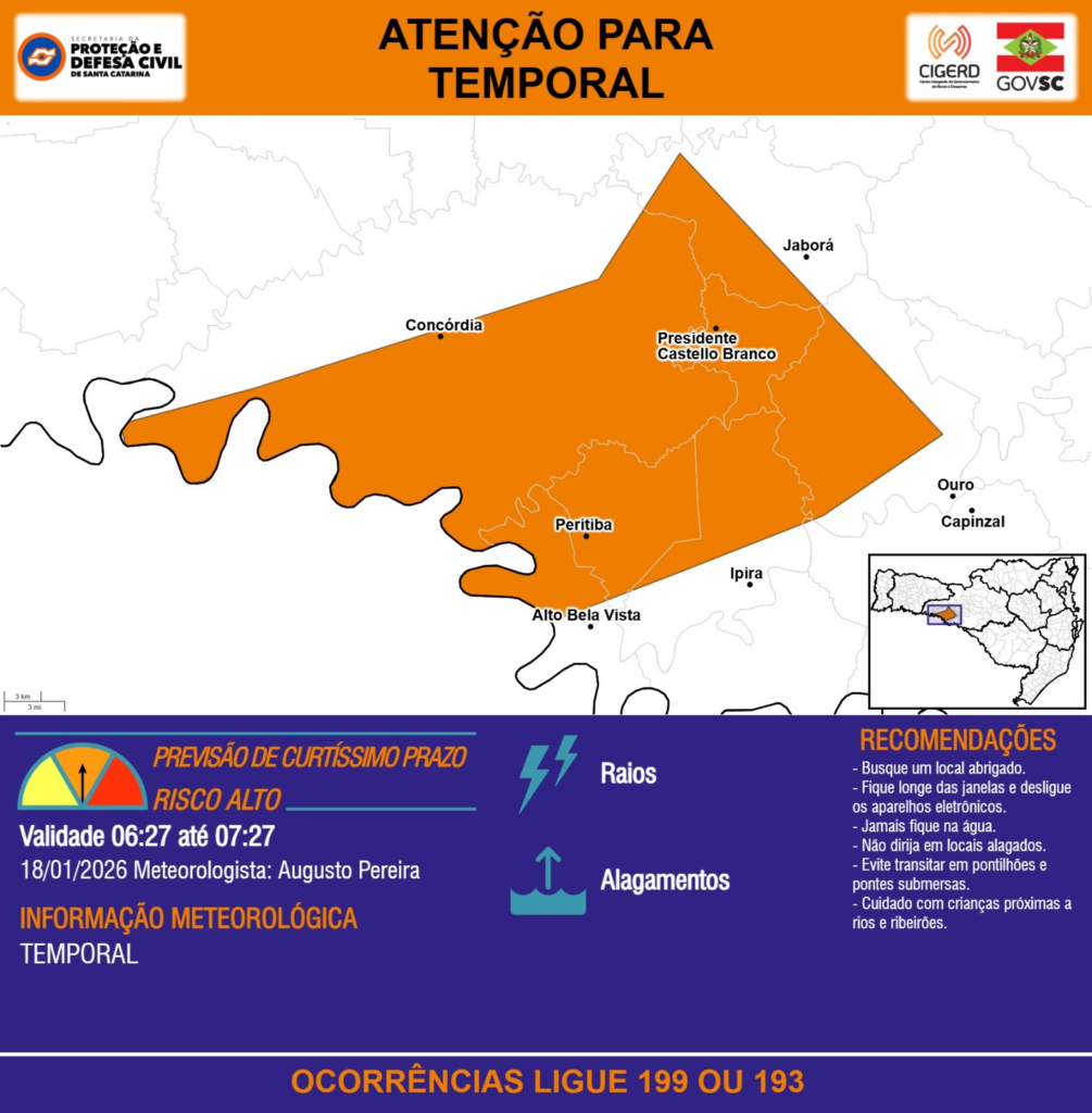 A Secretaria da Proteção e Defesa Civil segue monitorando as condições meteorológicas. Esteja preparado para tomar as ações necessárias em caso de agravamento da situação.
