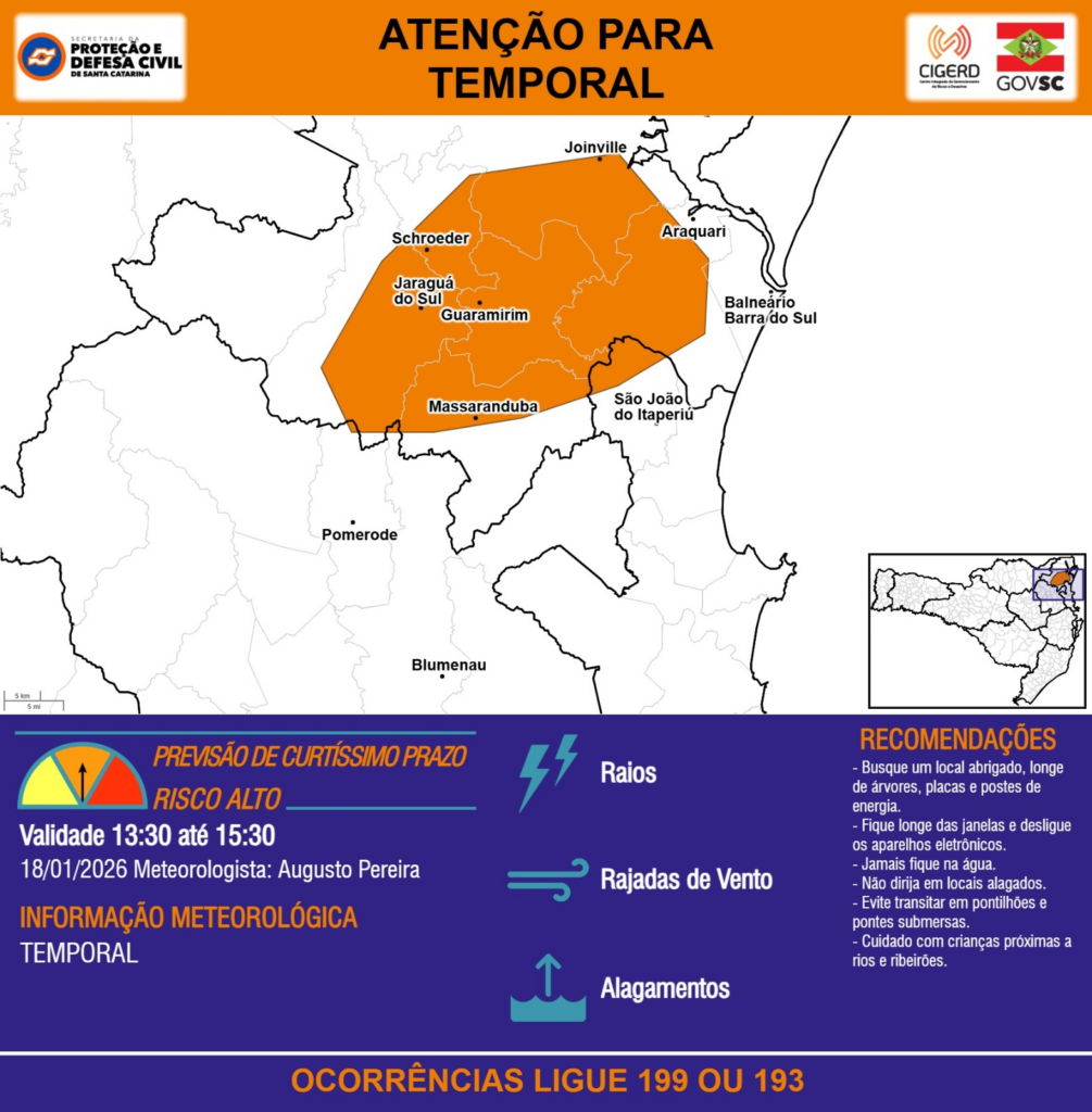 ATENÇÃO – 18/01 13:30 – TEMPORAL com RAIOS, RAJADAS DE VENTO e ALAGAMENTOS para as regiões do Litoral Norte, Baixo e Médio Vale do Itajaí nas próximas 2 horas. Ocorrências ligue 199 ou 193.