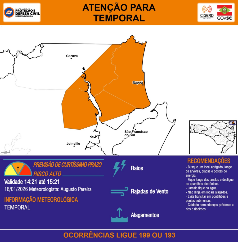 ATENÇÃO – 18/01 14:21 – TEMPORAL com RAIOS, RAJADAS DE VENTO e ALAGAMENTOS para os municípios de Garuva, Itapoá, Joinville e São Francisco do Sul na próxima hora. Ocorrências ligue 199 ou 193.