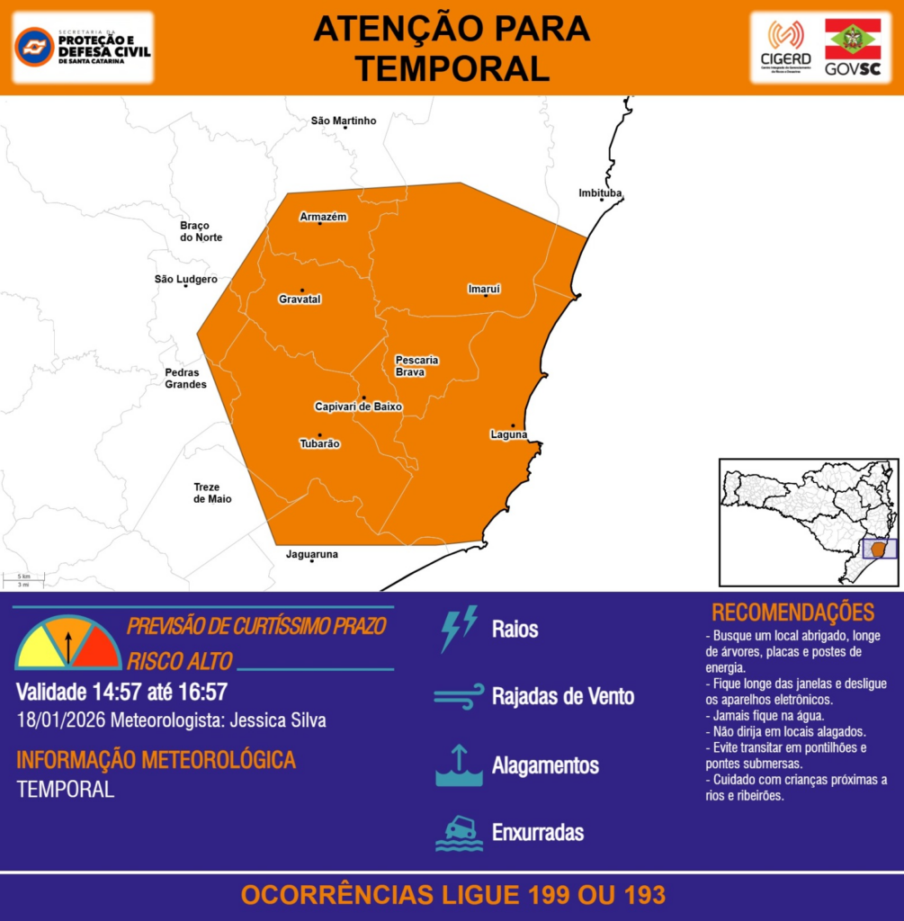 ATENÇÃO – 18/01 14:57 – TEMPORAL com RAIOS, RAJADAS DE VENTO, ALAGAMENTOS e risco de ENXURRADAS para os municípios de Armazém, Braço do Norte, Capivari de Baixo, Gravatal, Imaruí, Imbituba, Jaguaruna, Laguna, Pedras Grandes, Pescaria Brava, São Ludgero, São Martinho, Treze de Maio e Tubarão nas próximas 2 horas. Ocorrências ligue 199 ou 193.