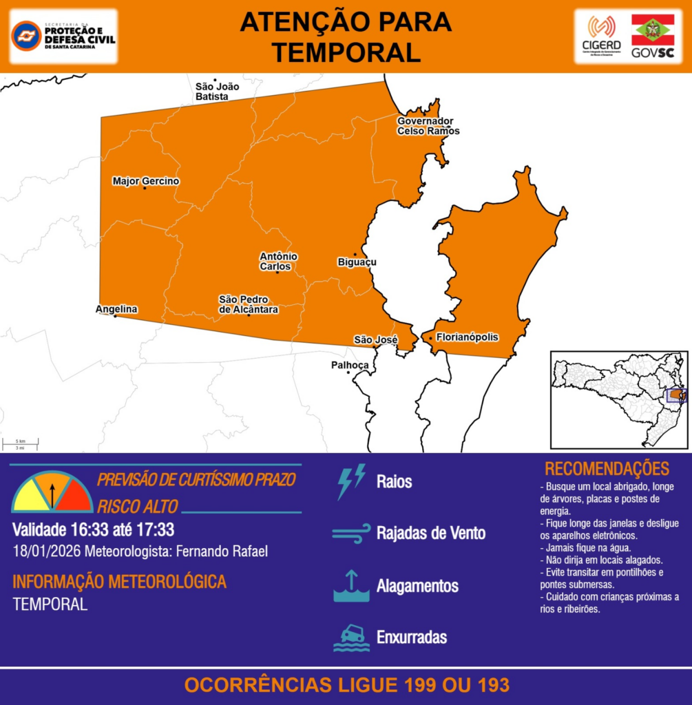 ATENÇÃO – 18/01 16:33 – TEMPORAL com RAIOS, RAJADAS DE VENTO, ALAGAMENTOS e risco de ENXURRADAS para os municípios de Angelina, Antônio Carlos, Biguaçu, Canelinha, Florianópolis, Governador Celso Ramos, Major Gercino, Palhoça, São José, São João Batista, São Pedro de Alcântara e Tijucas na próxima hora. Ocorrências ligue 199 ou 193.