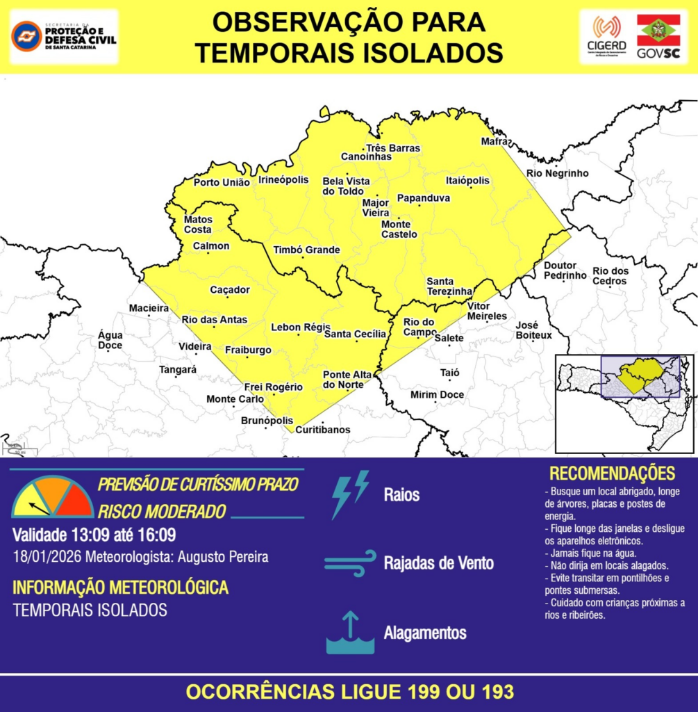 OBSERVAÇÃO – 18/01 13:09 – TEMPORAIS ISOLADOS com RAIOS, RAJADAS DE VENTO e ALAGAMENTOS pontuais para as regiões do Meio-Oeste, Planalto Norte, Médio e Alto Vale do Itajaí nas próximas 3 horas. Ocorrências ligue 199 ou 193.