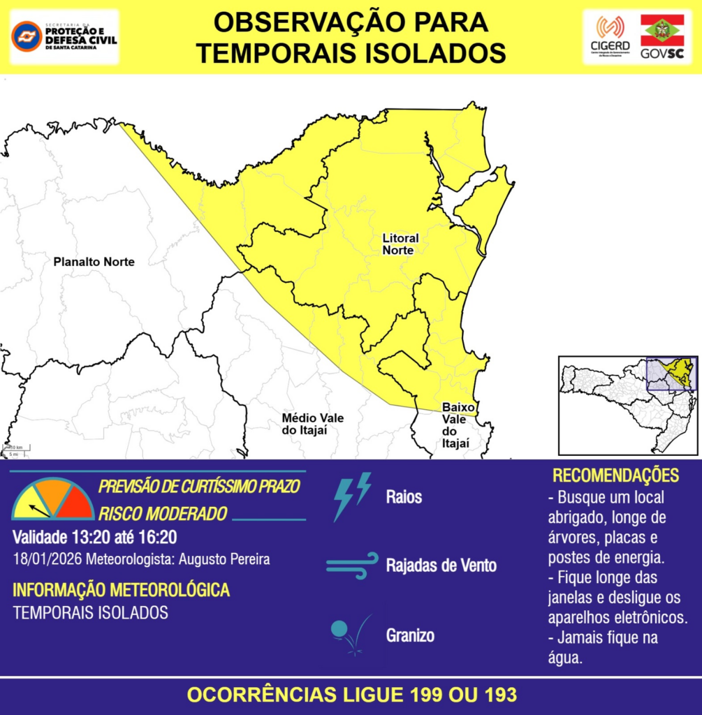 OBSERVAÇÃO – 18/01 13:20 – TEMPORAIS ISOLADOS com RAIOS, RAJADAS DE VENTO e GRANIZO para as regiões do Planalto Norte, Litoral Norte, Baixo e Médio Vale do Itajaí nas próximas 3 horas. Ocorrências ligue 199 ou 193.