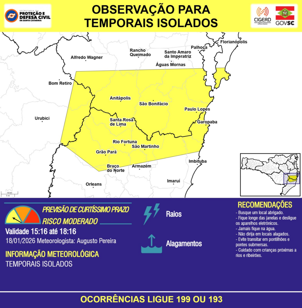 OBSERVAÇÃO – 18/01 15:16 – TEMPORAIS ISOLADOS com RAIOS e ALAGAMENTOS pontuais para as regiões do Planalto Sul, Litoral Sul e Grande Florianópolis nas próximas 3 horas. Ocorrências ligue 199 ou 193.