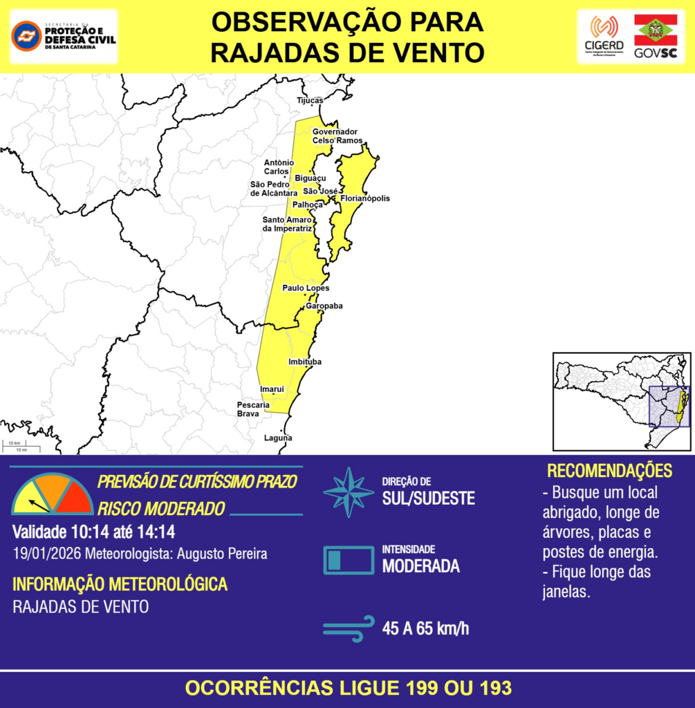 OBSERVAÇÃO – 19/01 10:14 – RAJADAS DE VENTO de quadrante sul/sudeste, com intensidade MODERADA (45 a 65 km/h), para os municípios de Antônio Carlos, Biguaçu, Florianópolis, Garopaba, Governador Celso Ramos, Imaruí, Imbituba, Laguna, Palhoça, Paulo Lopes, Pescaria Brava, Santo Amaro da Imperatriz, São José, São Pedro de Alcântara e Tijucas nas próximas 4 horas. Ocorrências ligue 199 ou 193.