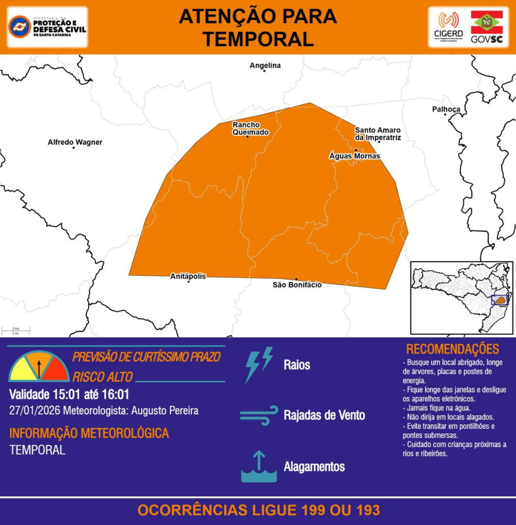 ATENÇÃO – 27/01 15:01 – TEMPORAL com RAIOS, RAJADAS DE VENTO e ALAGAMENTOS para os municípios de Alfredo Wagner, Angelina, Anitápolis, Palhoça, Paulo Lopes, Rancho Queimado, Santo Amaro da Imperatriz, São Bonifácio e Águas Mornas na próxima hora. Ocorrências ligue 199 ou 193.