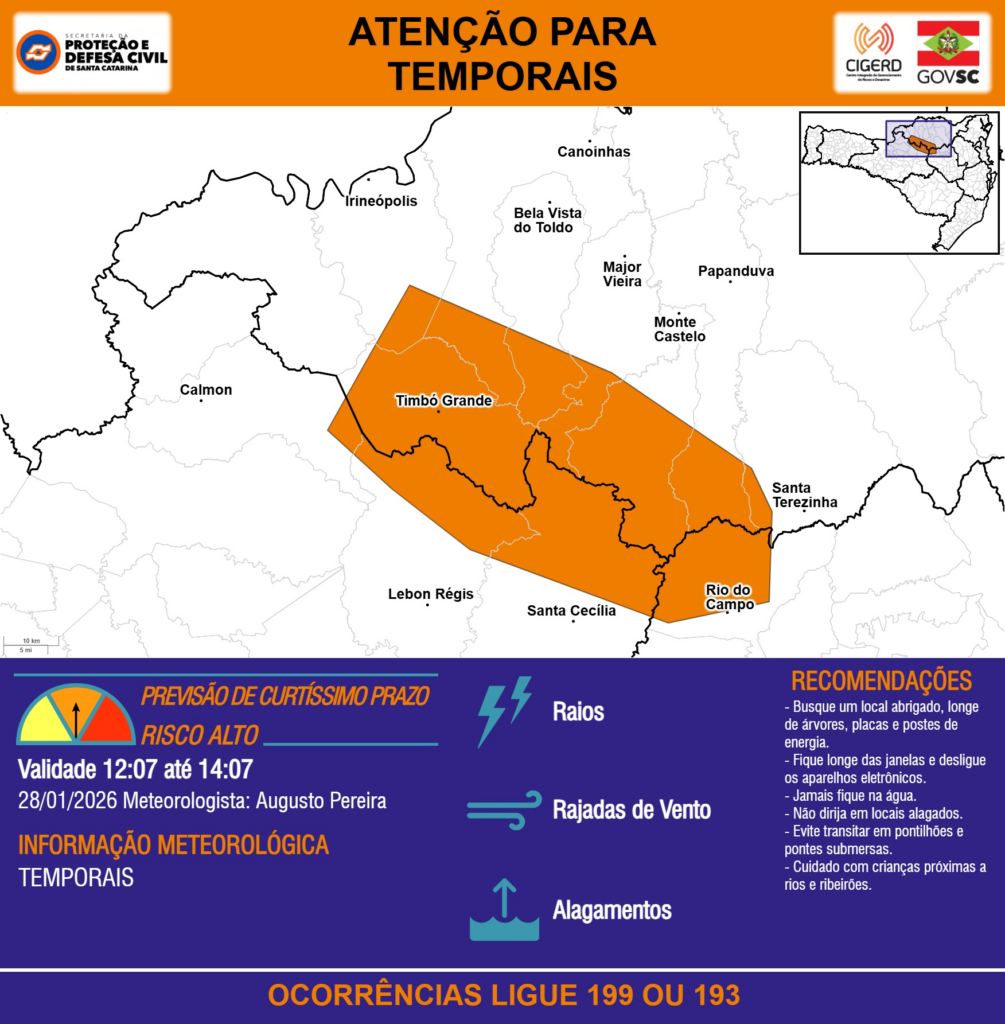 ATENÇÃO – 28/01 12:07 – TEMPORAIS com RAIOS, RAJADAS DE VENTO e ALAGAMENTOS para os municípios de Bela Vista do Toldo, Calmon, Canoinhas, Irineópolis, Lebon Régis, Major Vieira, Monte Castelo, Papanduva, Rio do Campo, Santa Cecília, Santa Terezinha e Timbó Grande nas próximas 2 horas. Ocorrências ligue 199 ou 193.