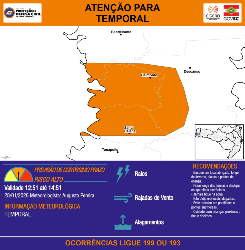 ATENÇÃO – 28/01 12:51 – TEMPORAL com RAIOS, RAJADAS DE VENTO e ALAGAMENTOS para os municípios de Bandeirante, Belmonte, Descanso, Santa Helena e Tunápolis nas próximas 2 horas. Ocorrências ligue 199 ou 193.