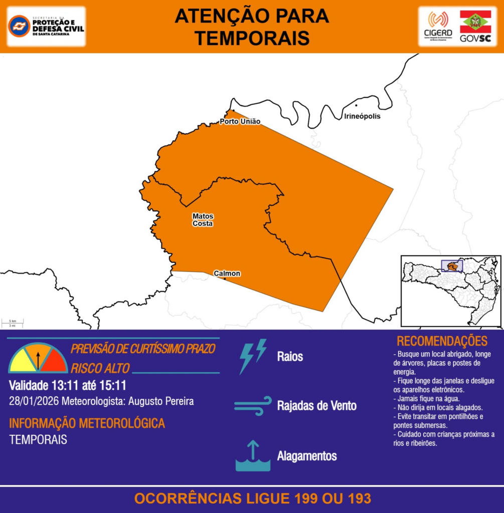 ATENÇÃO – 28/01 13:11 – TEMPORAIS com RAIOS, RAJADAS DE VENTO e ALAGAMENTOS para os municípios de Calmon, Irineópolis, Matos Costa e Porto União nas próximas 2 horas. Ocorrências ligue 199 ou 193.