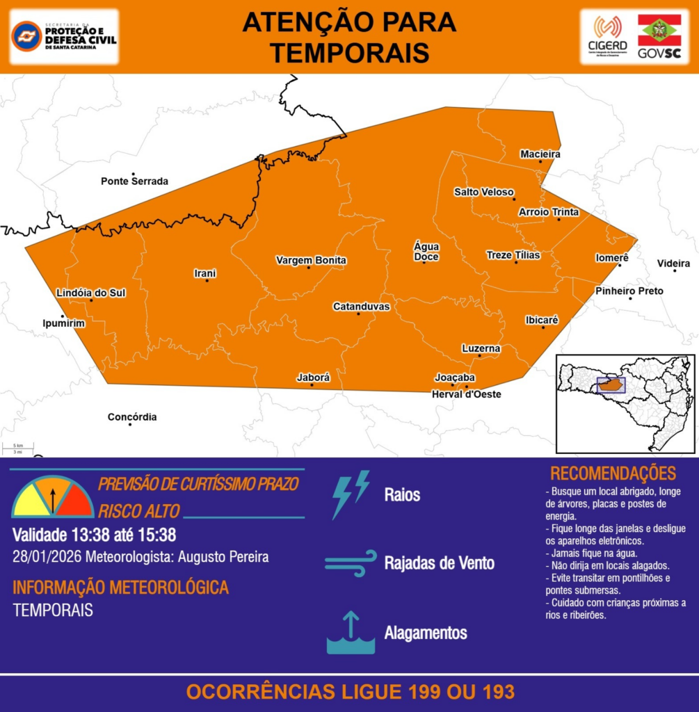 ATENÇÃO – 28/01 13:38 – TEMPORAIS com RAIOS, RAJADAS DE VENTO e ALAGAMENTOS para os municípios de Arroio Trinta, Catanduvas, Concórdia, Herval d’Oeste, Ibicaré, Iomerê, Ipumirim, Irani, Jaborá, Joaçaba, Lindóia do Sul, Luzerna, Macieira, Pinheiro Preto, Ponte Serrada, Salto Veloso, Treze Tílias, Vargem Bonita, Videira e Água Doce nas próximas 2 horas. Ocorrências ligue 199 ou 193.