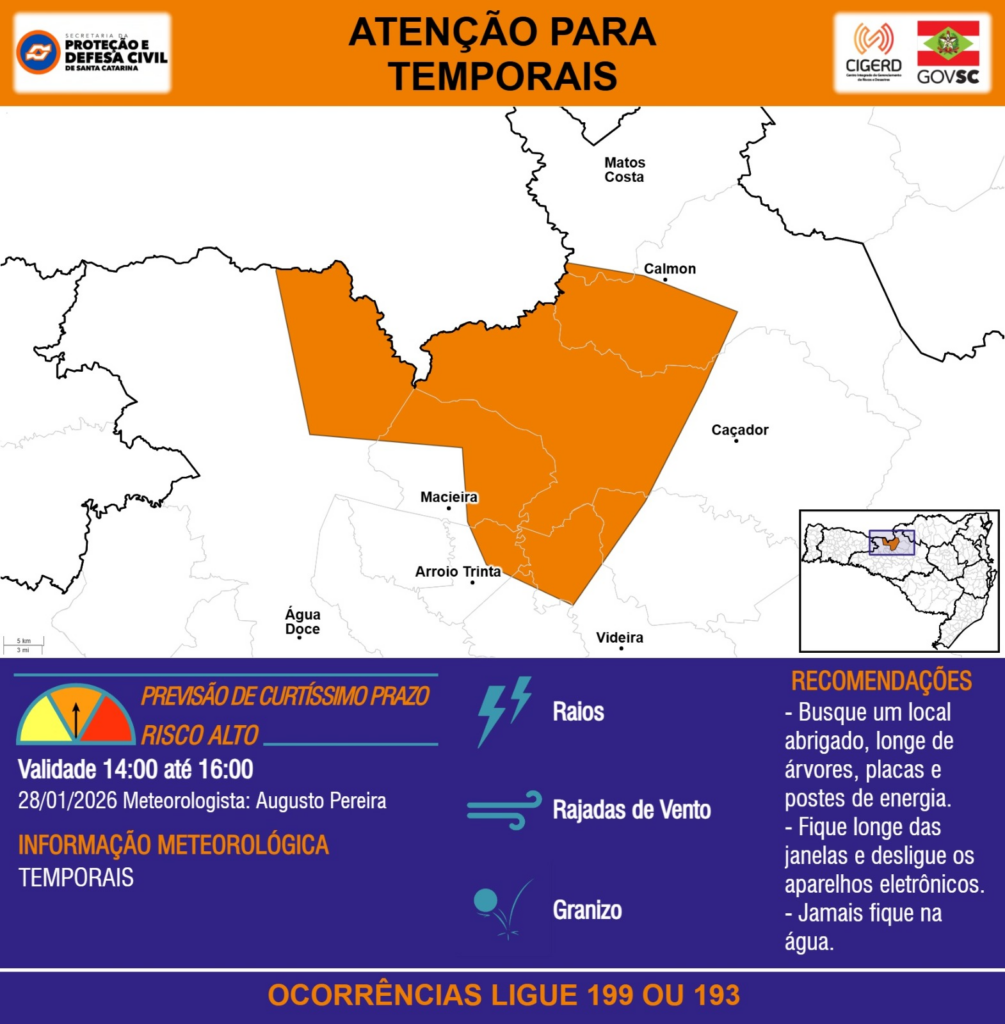 ATENÇÃO – 28/01 14:00 – TEMPORAIS com RAIOS, RAJADAS DE VENTO e GRANIZO para os municípios de Arroio Trinta, Calmon, Caçador, Macieira, Matos Costa, Videira e Água Doce nas próximas 2 horas. Ocorrências ligue 199 ou 193.