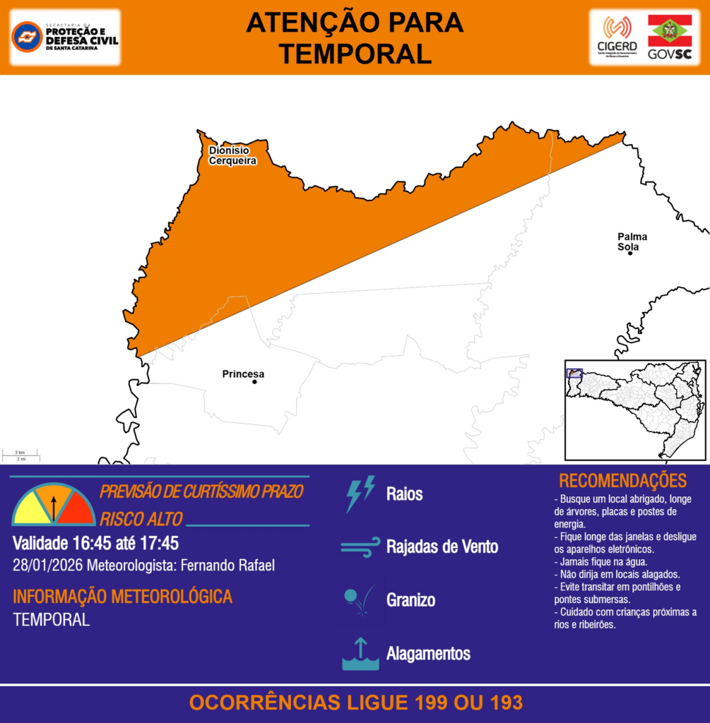 ATENÇÃO – 28/01 16:45 – TEMPORAL com RAIOS, RAJADAS DE VENTO, GRANIZO e ALAGAMENTOS para os municípios de Dionísio Cerqueira, Palma Sola e Princesa na próxima hora. Ocorrências ligue 199 ou 193.