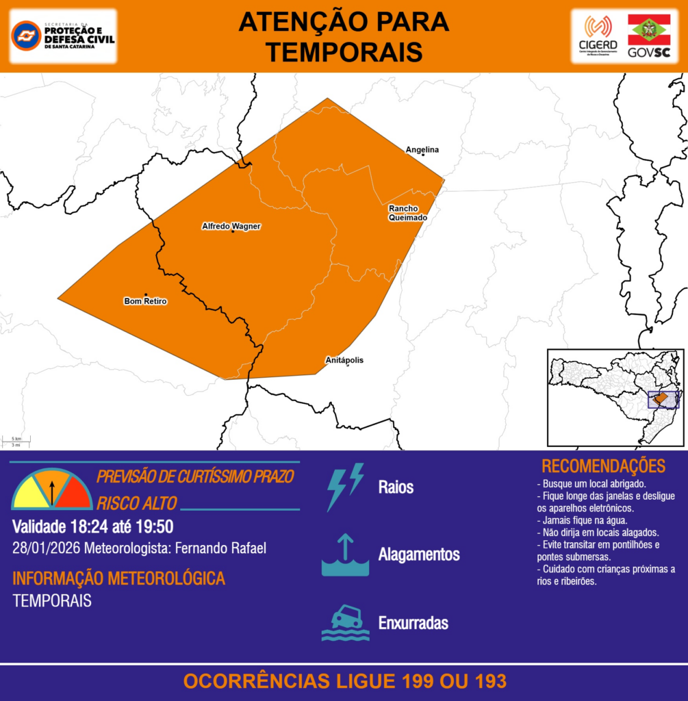 ATENÇÃO – 28/01 18:24 – TEMPORAIS com RAIOS, ALAGAMENTOS e risco de ENXURRADAS para os municípios de Alfredo Wagner, Angelina, Anitápolis, Bom Retiro, Major Gercino, Rancho Queimado na próxima hora. Ocorrências ligue 199 ou 193.