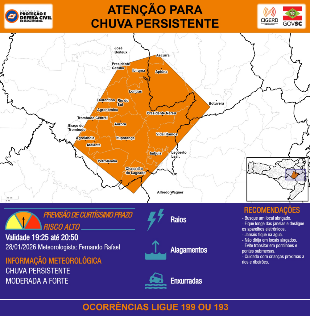 ATENÇÃO – 28/01 19:25 – CHUVA PERSISTENTE de intensidade moderada a forte com RAIOS, ALAGAMENTOS e risco de ENXURRADAS para os municípios de Agrolândia, Agronômica, Alfredo Wagner, Apiúna, Ascurra, Atalanta, Aurora, Bom Retiro, Botuverá, Braço do Trombudo, Chapadão do Lageado, Ibirama, Imbuia, Ituporanga, José Boiteux, Laurentino, Leoberto Leal, Lontras, Petrolândia, Presidente Getúlio, Presidente Nereu, Rio do Sul, Trombudo Central e Vidal Ramos na próxima hora. Ocorrências ligue 199 ou 193.