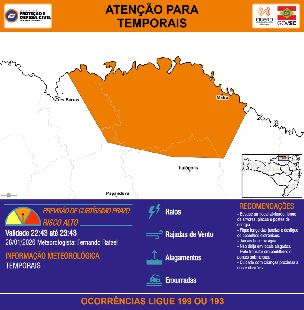 ATENÇÃO – 28/01 22:43 – TEMPORAIS com RAIOS, RAJADAS DE VENTO, ALAGAMENTOS e risco de ENXURRADAS para os municípios de Itaiópolis, Mafra, Papanduva e Três Barras na próxima hora. Ocorrências ligue 199 ou 193.