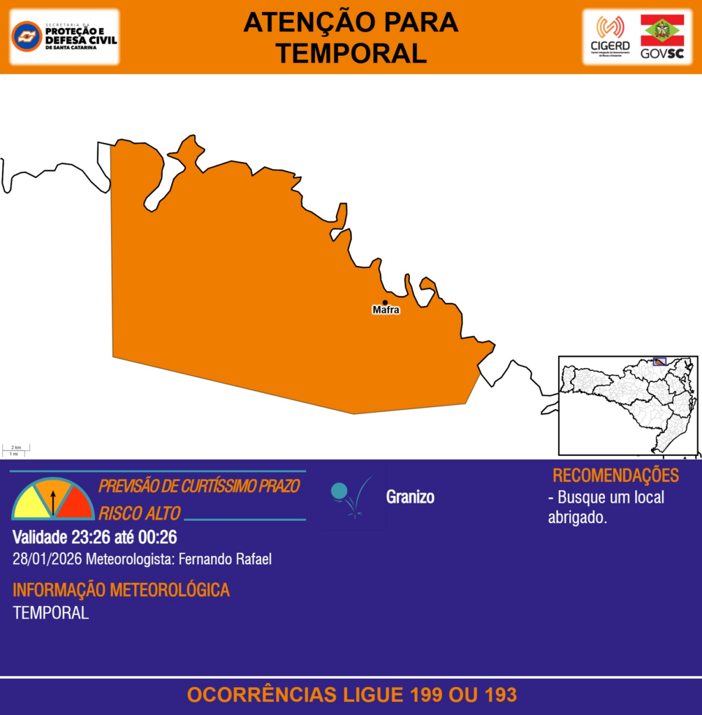 ATENÇÃO – 28/01 23:26 – TEMPORAL com GRANIZO para o município de Mafra na próxima hora. Ocorrências ligue 199 ou 193.