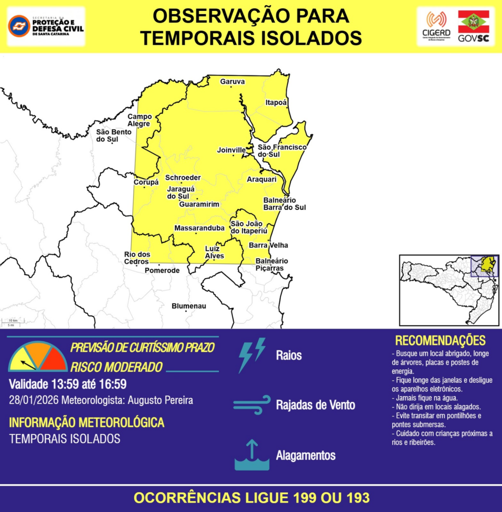 OBSERVAÇÃO – 28/01 13:59 – TEMPORAIS ISOLADOS com RAIOS, RAJADAS DE VENTO e ALAGAMENTOS pontuais para os municípios de Araquari, Balneário Barra do Sul, Balneário Piçarras, Barra Velha, Blumenau, Campo Alegre, Corupá, Garuva, Guaramirim, Itapoá, Jaraguá do Sul, Joinville, Luiz Alves, Massaranduba, Pomerode, Rio dos Cedros, Schroeder, São Bento do Sul, São Francisco do Sul e São João do Itaperiú nas próximas 3 horas. Ocorrências ligue 199 ou 193.
