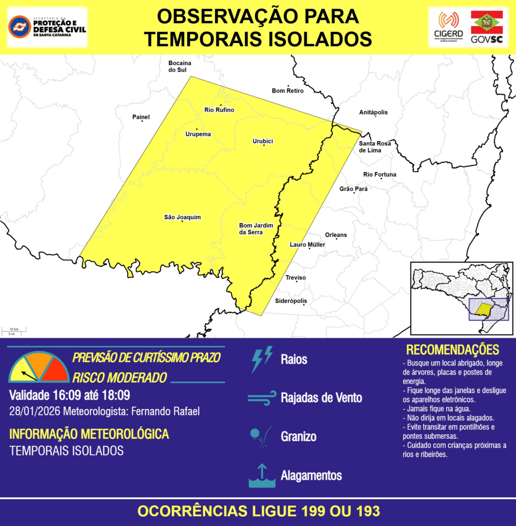 OBSERVAÇÃO – 28/01 16:09 – TEMPORAIS ISOLADOS com RAIOS, RAJADAS DE VENTO, GRANIZO e ALAGAMENTOS pontuais para os municípios de Anitápolis, Bocaina do Sul, Bom Jardim da Serra, Bom Retiro, Grão Pará, Lauro Müller, Orleans, Painel, Rio Fortuna, Rio Rufino, Santa Rosa de Lima, Siderópolis, São Joaquim, Treviso, Urubici e Urupema nas próximas 2 horas. Ocorrências ligue 199 ou 193.