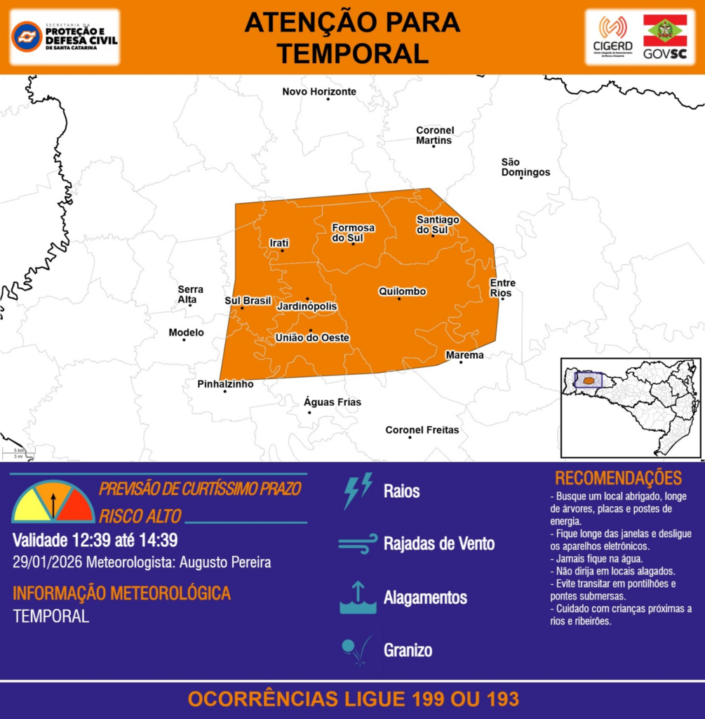 ATENÇÃO – 29/01 12:39 – TEMPORAL com RAIOS, RAJADAS DE VENTO, ALAGAMENTOS e GRANIZO para a região do Oeste nas próximas 2 horas. Ocorrências ligue 199 ou 193.