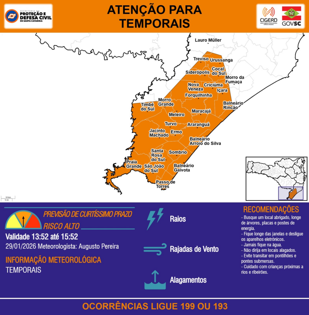 ATENÇÃO – 29/01 13:52 – TEMPORAIS com RAIOS, RAJADAS DE VENTO e ALAGAMENTOS nas próximas 2 horas. Ocorrências ligue 199 ou 193.