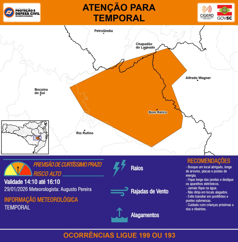 ATENÇÃO – 29/01 14:10 – TEMPORAL com RAIOS, RAJADAS DE VENTO e ALAGAMENTOS para os municípios de Alfredo Wagner, Bocaina do Sul, Bom Retiro, Chapadão do Lageado, Petrolândia e Rio Rufino nas próximas 2 horas. Ocorrências ligue 199 ou 193.