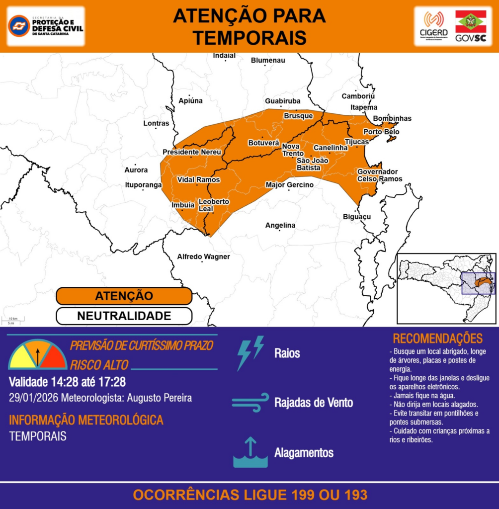 ATENÇÃO – 29/01 14:28 – TEMPORAIS com RAIOS, RAJADAS DE VENTO e ALAGAMENTOS para os municípios de Alfredo Wagner, Angelina, Apiúna, Aurora, Biguaçu, Blumenau, Bombinhas, Botuverá, Brusque, Camboriú, Canelinha, Governador Celso Ramos, Guabiruba, Imbuia, Indaial, Itapema, Ituporanga, Leoberto Leal, Lontras, Major Gercino, Nova Trento, Porto Belo, Presidente Nereu, São João Batista, Tijucas e Vidal Ramos nas próximas 3 horas. Ocorrências ligue 199 ou 193.