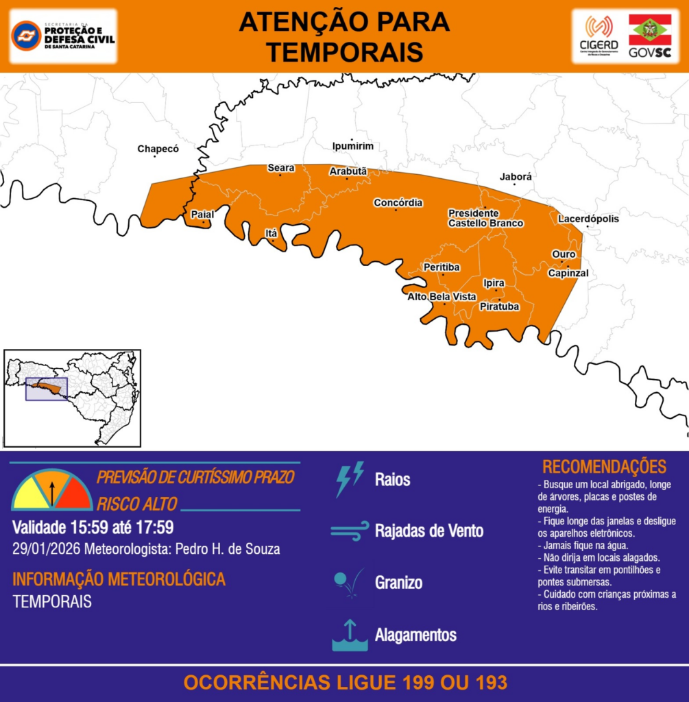 ATENÇÃO – 29/01 15:59 – TEMPORAIS com RAIOS, RAJADAS DE VENTO, GRANIZO e ALAGAMENTOS para áreas das regiões do Oeste e Meio-Oeste nas próximas 2 horas. Ocorrências ligue 199 ou 193.