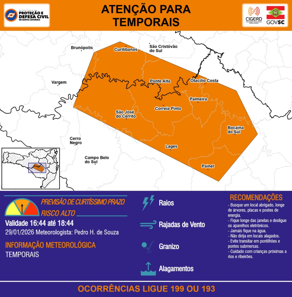 ATENÇÃO – 29/01 16:44 – TEMPORAIS com RAIOS, RAJADAS DE VENTO, GRANIZO e ALAGAMENTOS para áreas das regiões do Meio-Oeste e Planalto Sul nas próximas 2 horas. Ocorrências ligue 199 ou 193.