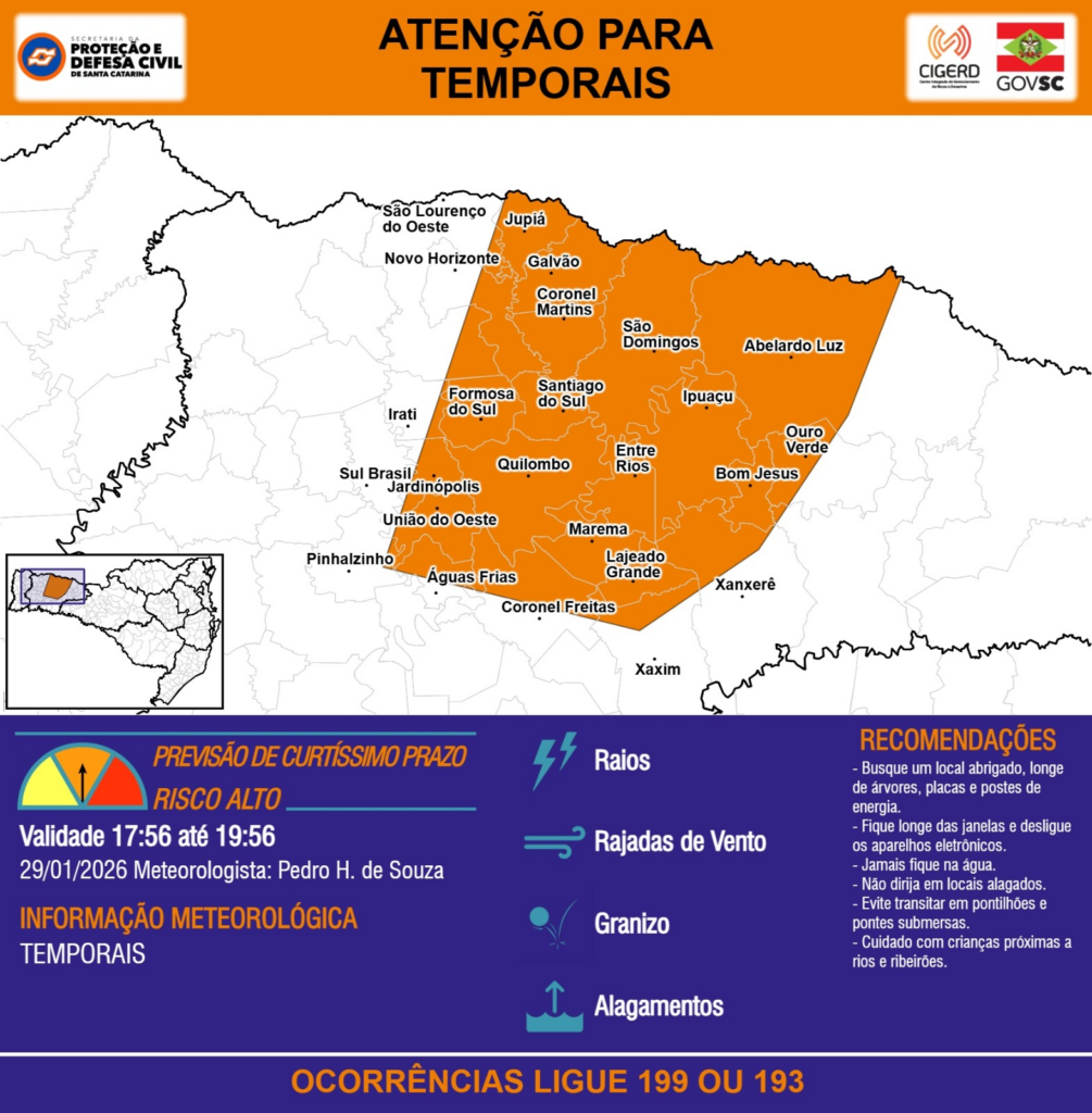 ATENÇÃO – 29/01 17:56 – TEMPORAIS com RAIOS, RAJADAS DE VENTO, GRANIZO e ALAGAMENTOS nas próximas 2 horas. Ocorrências ligue 199 ou 193.