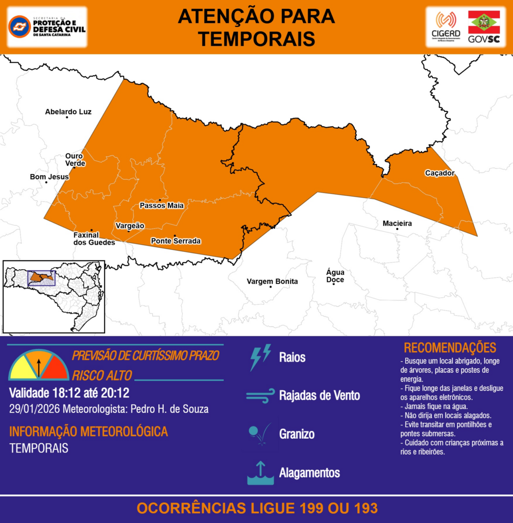 ATENÇÃO – 29/01 18:12 – TEMPORAIS com RAIOS, RAJADAS DE VENTO, GRANIZO e ALAGAMENTOS para áreas das regiões do Oeste e Meio-Oeste nas próximas 2 horas. Ocorrências ligue 199 ou 193.