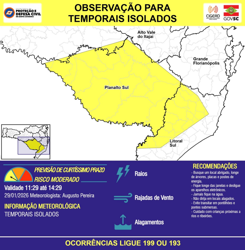 OBSERVAÇÃO – 29/01 11:29 – TEMPORAIS ISOLADOS com RAIOS, RAJADAS DE VENTO e ALAGAMENTOS pontuais para as regiões do Meio-Oeste, Planalto Sul, Litoral Sul, Grande Florianópolis e Alto Vale do Itajaí nas próximas 3 horas. Ocorrências ligue 199 ou 193.