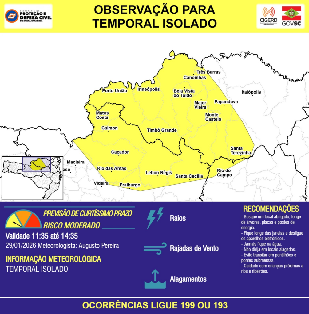OBSERVAÇÃO – 29/01 11:35 – TEMPORAL ISOLADO com RAIOS, RAJADAS DE VENTO e ALAGAMENTOS pontuais para as regiões do Meio-Oeste, Planalto Norte e Alto Vale do Itajaí nas próximas 3 horas. Ocorrências ligue 199 ou 193.