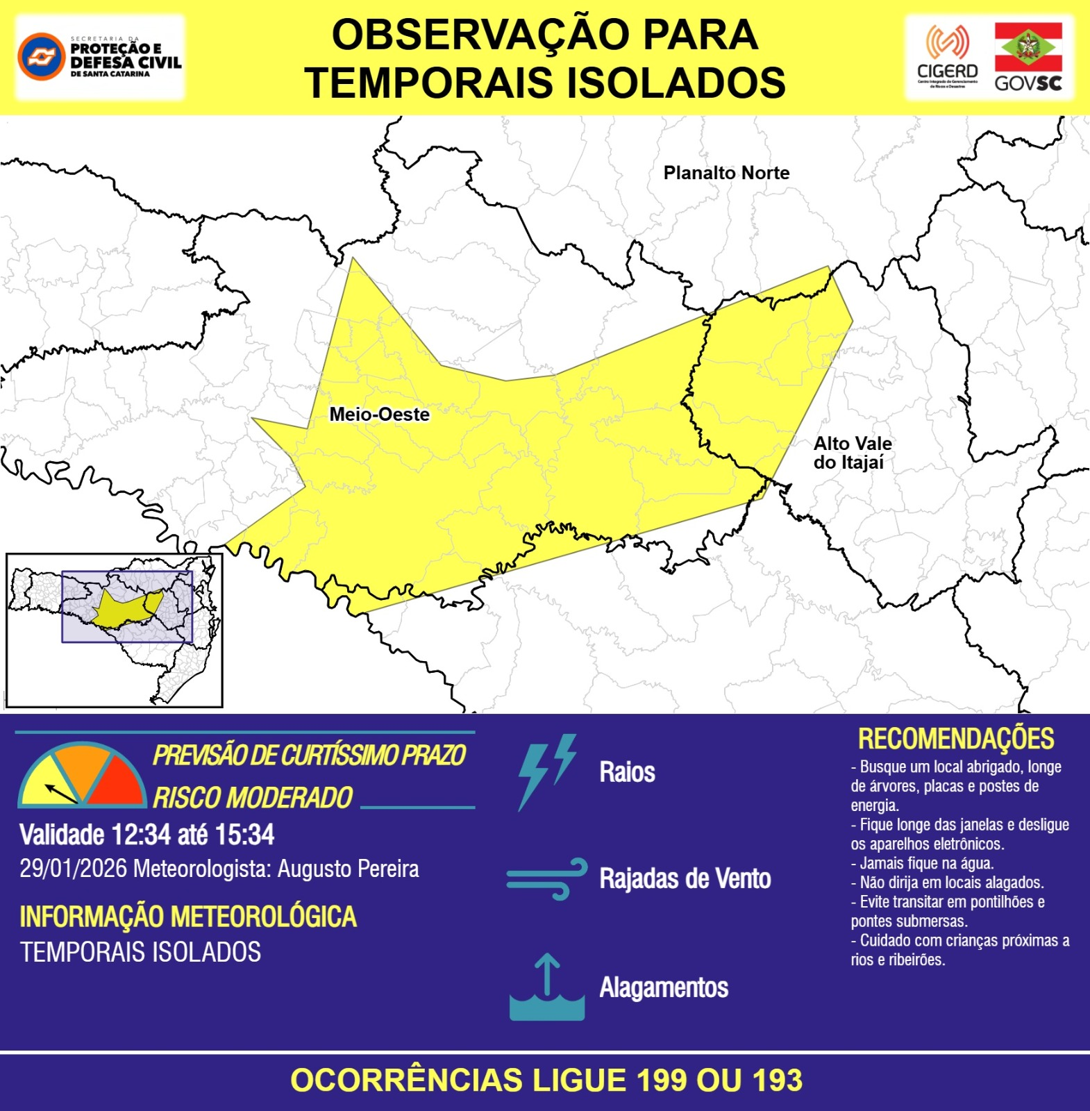 OBSERVAÇÃO – 29/01 12:34 – TEMPORAIS ISOLADOS com RAIOS, RAJADAS DE VENTO e ALAGAMENTOS pontuais para as regiões do Meio-Oeste, Planalto Norte, Planalto Sul e Alto Vale do Itajaí nas próximas 3 horas. Ocorrências ligue 199 ou 193.