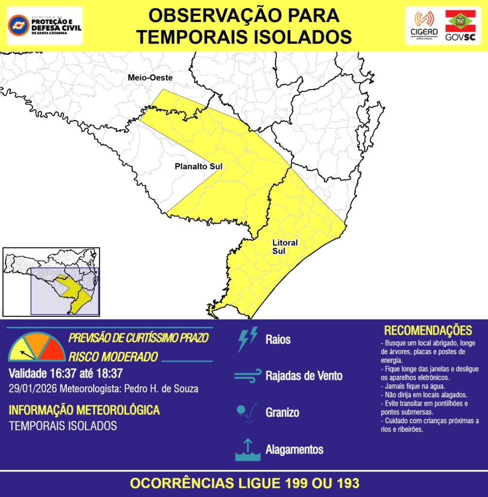 OBSERVAÇÃO – 29/01 16:37 – TEMPORAIS ISOLADOS com RAIOS, RAJADAS DE VENTO, GRANIZO e ALAGAMENTOS pontuais para áreas das regiões do Meio-Oeste, Planalto Sul e Litoral Sul nas próximas 2 horas. Ocorrências ligue 199 ou 193.