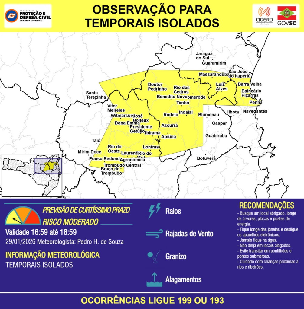 OBSERVAÇÃO – 29/01 16:59 – TEMPORAIS ISOLADOS com RAIOS, RAJADAS DE VENTO, GRANIZO e ALAGAMENTOS pontuais para áreas das regiões do Planalto Norte, Litoral Norte, Baixo, Médio e Alto Vale do Itajaí nas próximas 2 horas. Ocorrências ligue 199 ou 193.